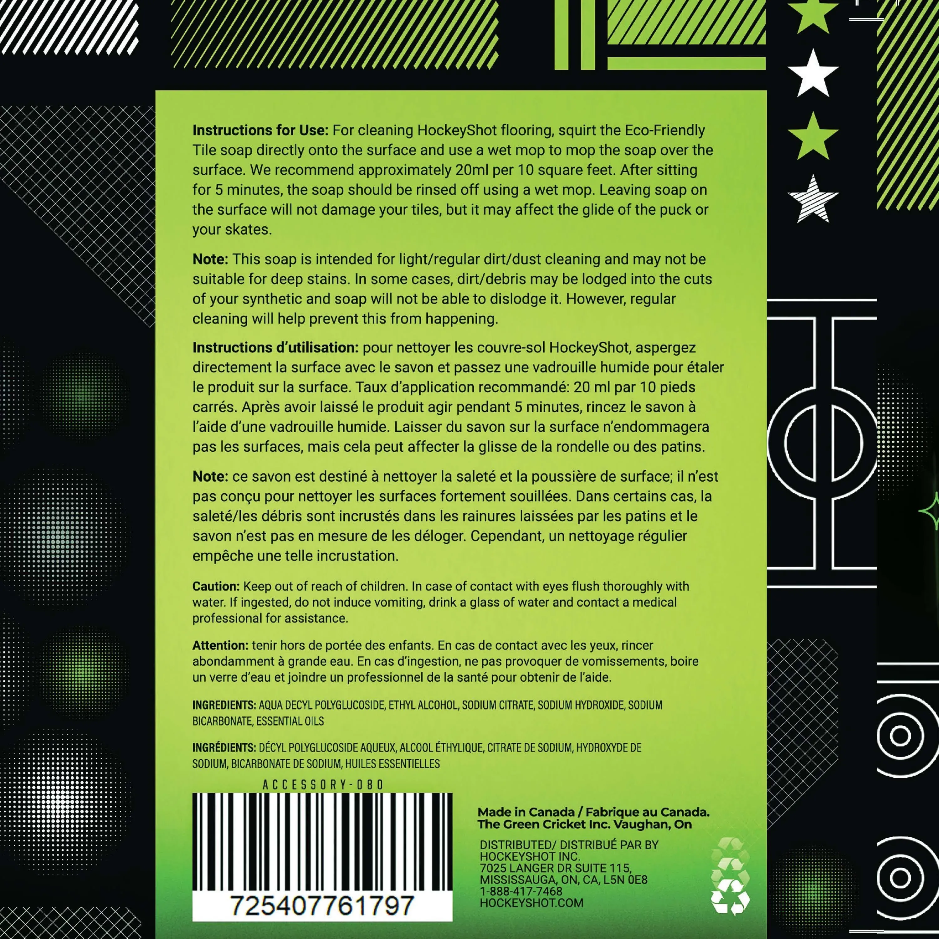Instructions for Use: For cleaning HockeyShot flooring, apply the Eco-Friendly Tile soap directly onto the surface and use a wet mop to mop the soap over the surface. We recommend approximately 20ml per 10 square feet. After sitting for 5 minutes, the soap should be rinsed off using a wet mop. Leaving soap on the surface will not damage your tiles, but it may affect the glide of the puck or your skates.
